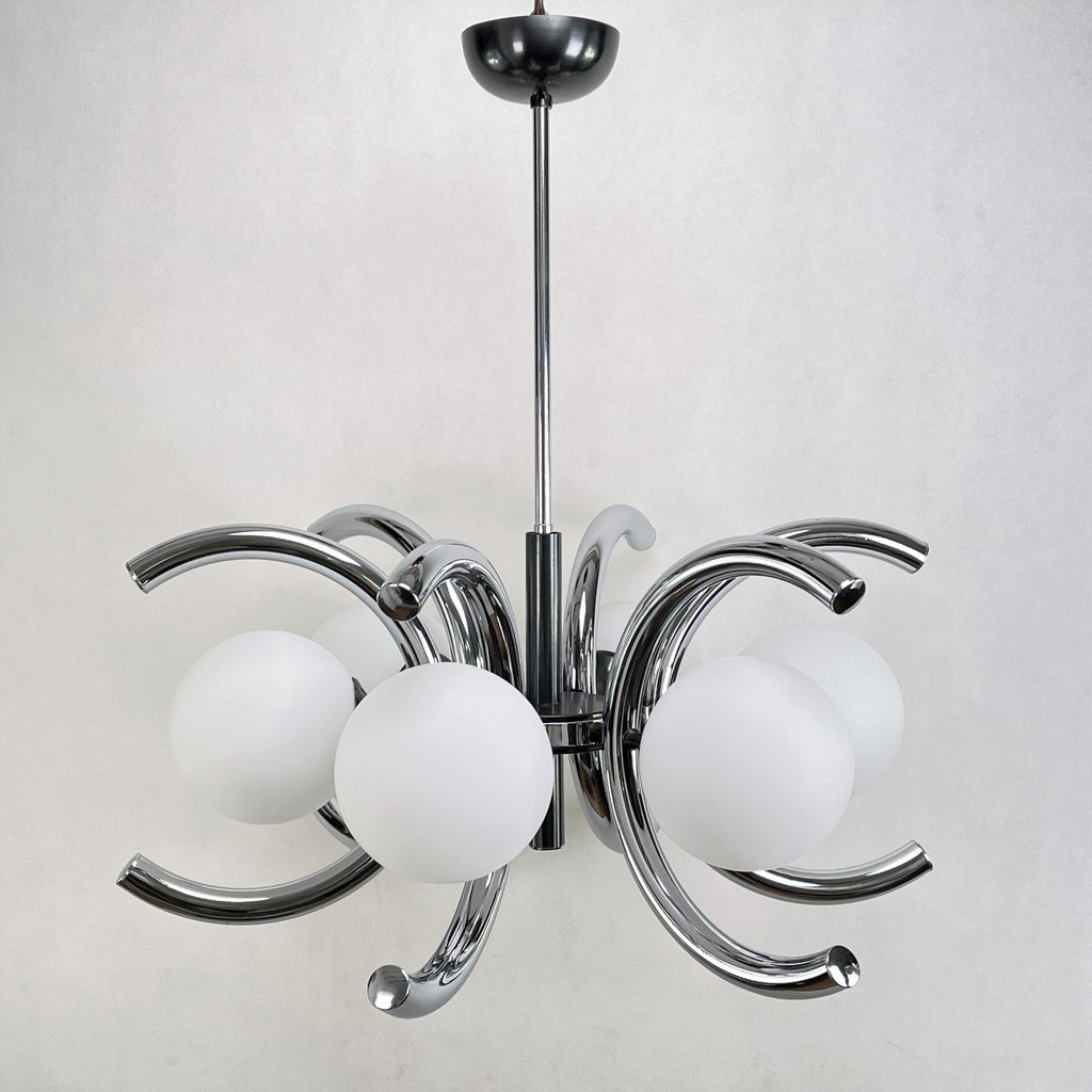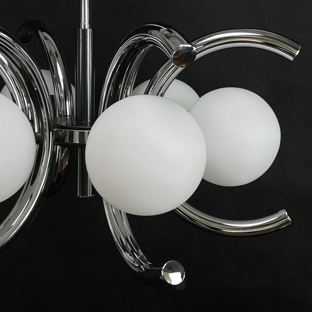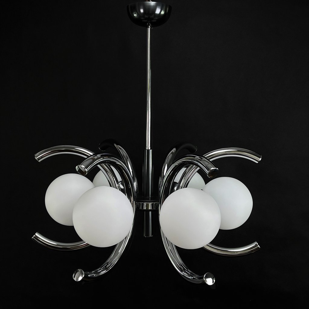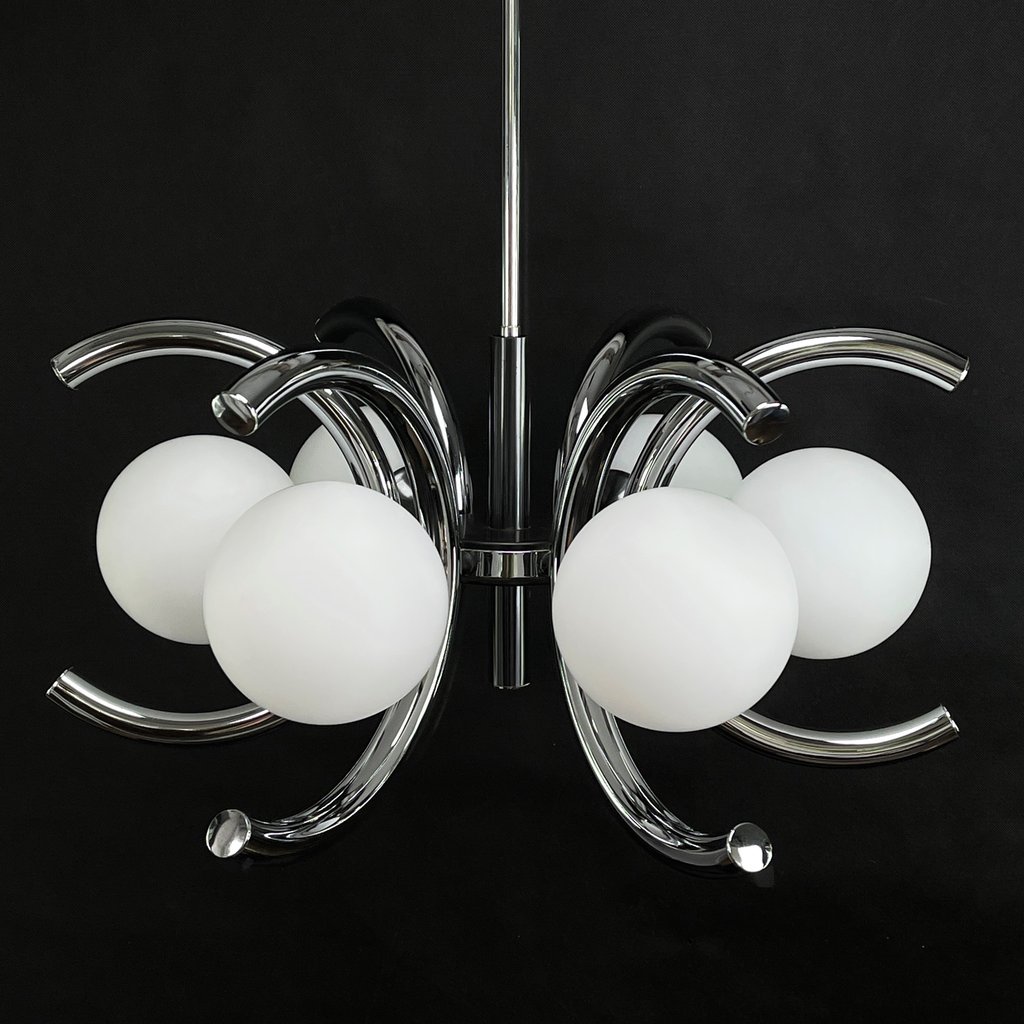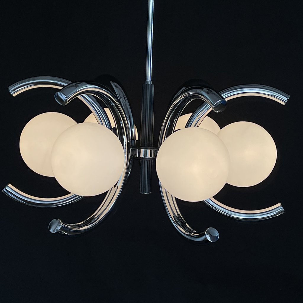 Diese exzellente Designer-Lampe mit 2 Schaltkreisen ist ein echter Klassiker aus den 60er/70er Jahren. Die Deckenlampe ist ein Original. Sie verfügt über 6 Brennstellen (Lieferung inkl. Leuchtmittel) und gibt ein angenehmes Licht.