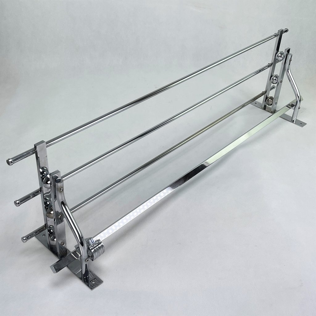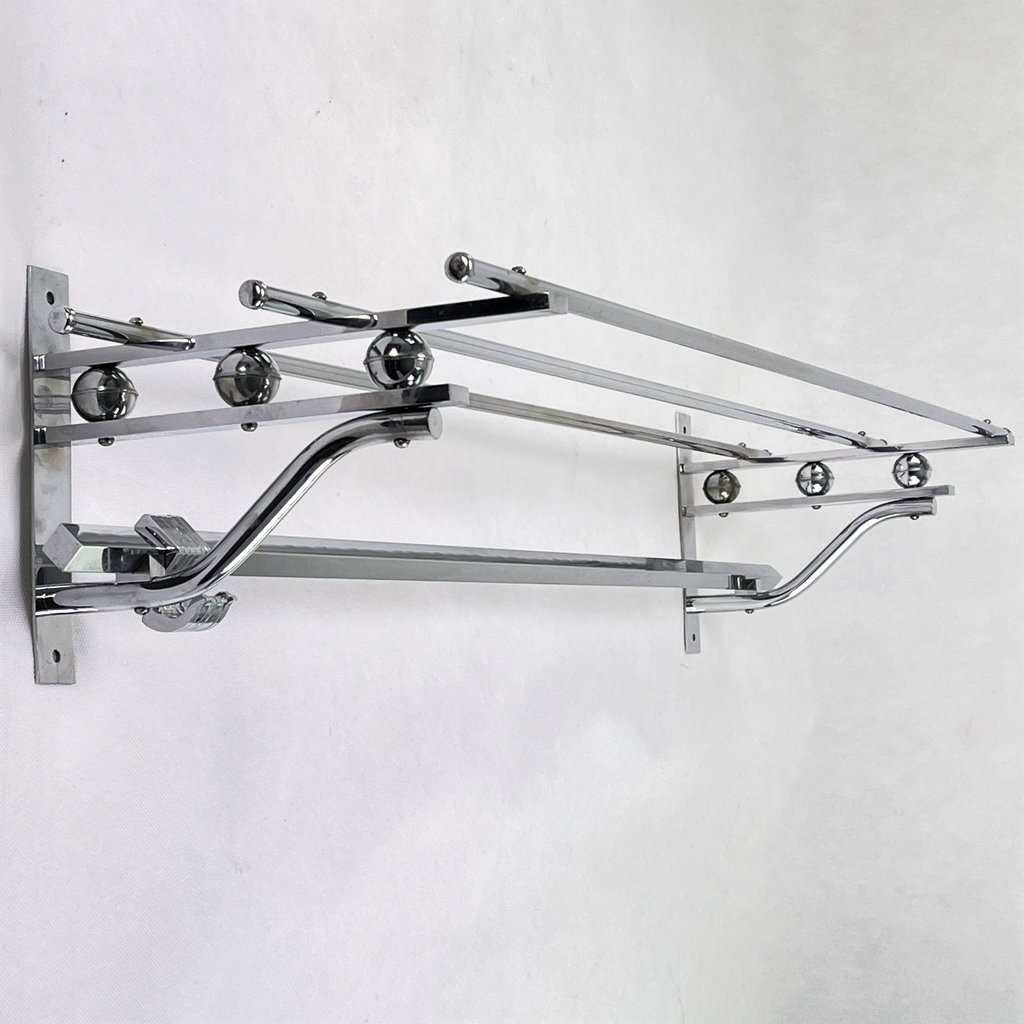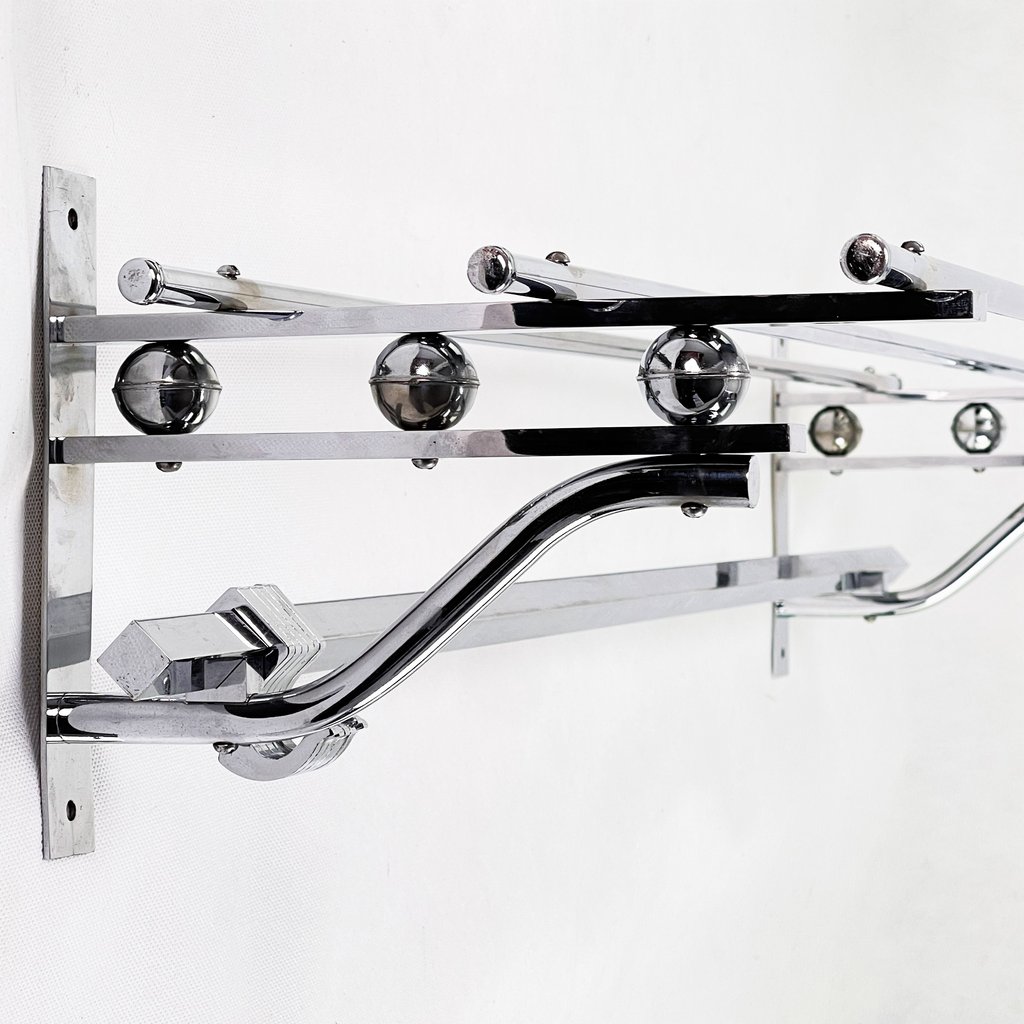 Diese Garderobe besitzt 6 bewegliche Haken zum Aufnehmen der Kleidungsstücke. Diese alte original Wandgarderobe ist aus verchromtem Metall.