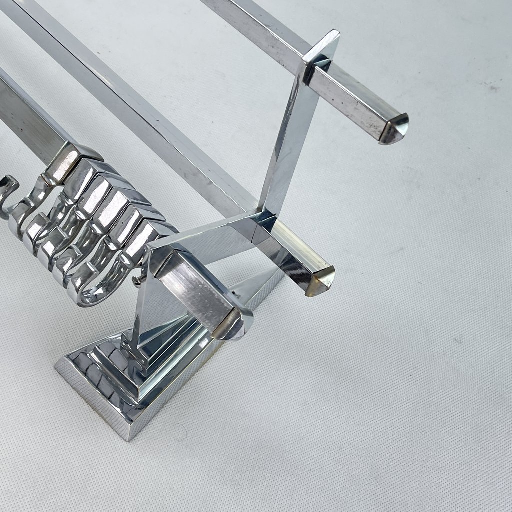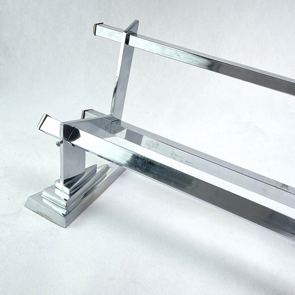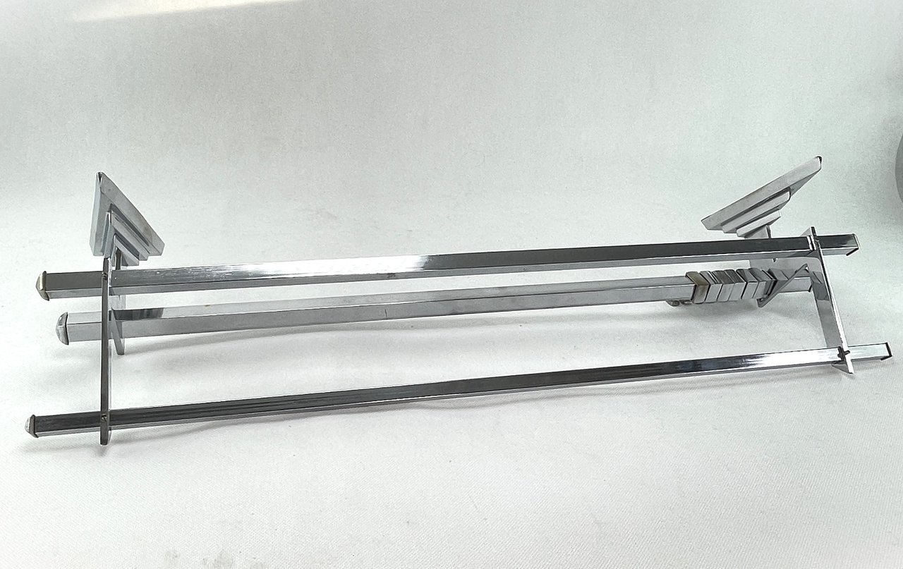 Diese Garderobe besitzt 6 bewegliche Haken zum Aufnehmen der Kleidungsstücke. Diese alte original Wandgarderobe ist verchromt.