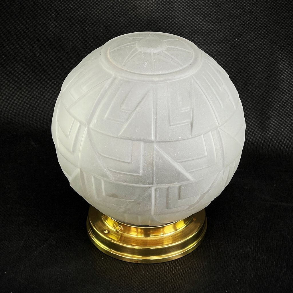 Diese wunderschöne ART DECO Lampe ist signiert hat eine Montur aus geschmiedetem Eisen. Die Glaskugel ist sehr beeindruckend und gibt ein angenehmes Licht.