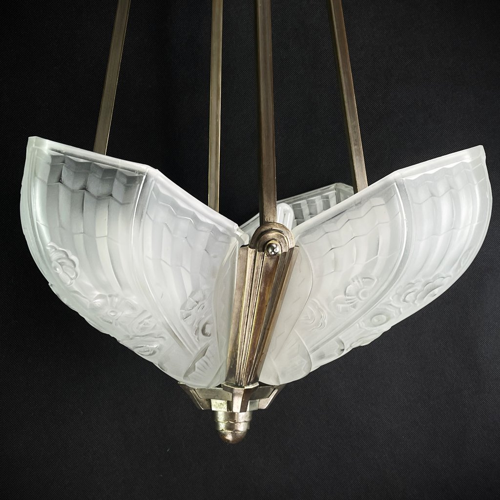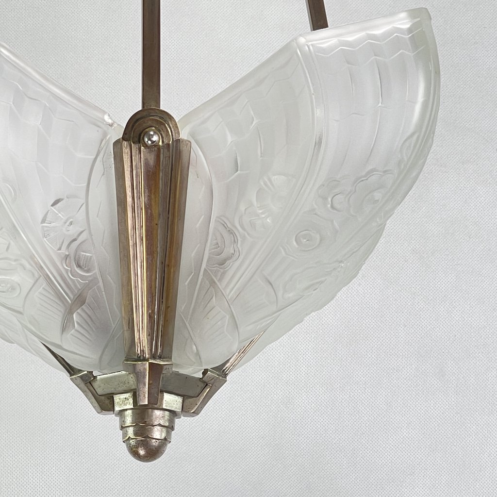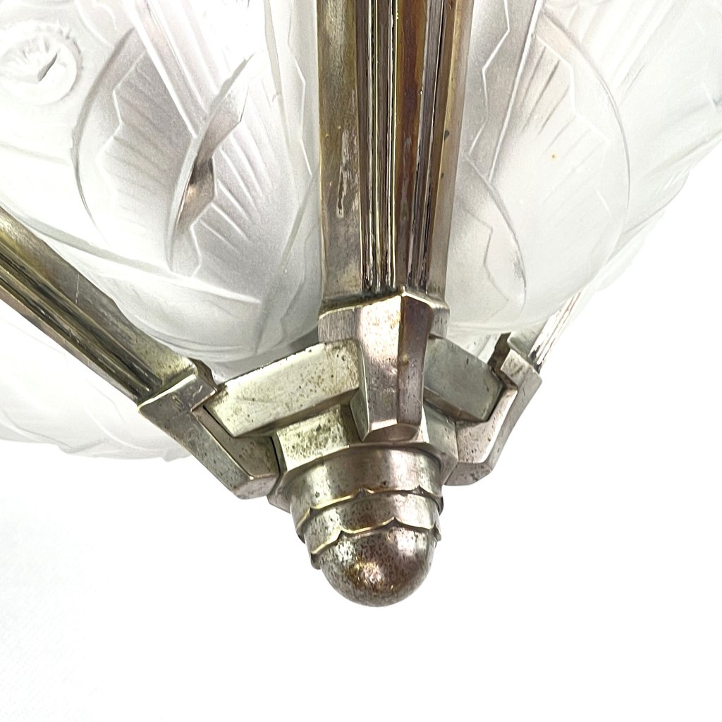 Die ART DECO Deckenlampe ist ein bemerkenswertes Beispiel für die Handwerkskunst und den Stil des frühen 20. Jahrhunderts. Die Deckenlampe ist ein Zeichen für die herausragende Handwerkskunst und Qualität, für die dieses renommierte Unternehmen bekannt ist. Sie kombiniert geschickt das robuste Material mit der zerbrechlichen Eleganz von Pressglas und vereint so Funktionalität und Ästhetik auf harmonische Weise.