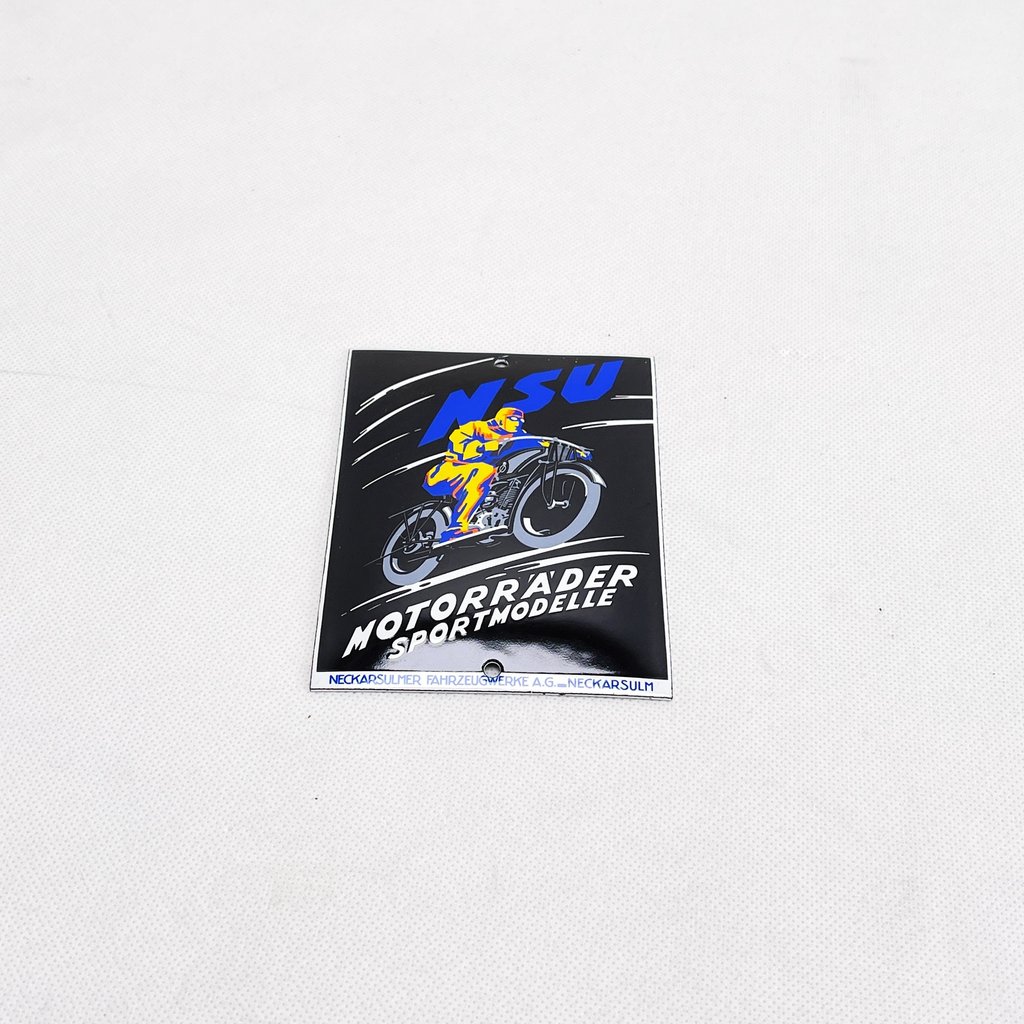 Dieses neuwertige, leicht gewölbte NSU Motorräder – LOGO – Emailleschild war nie an der Wand angebracht. Es hat an der Seite Befestigungslöcher. Es ist für den Innen- und Außenbereich geeignet.