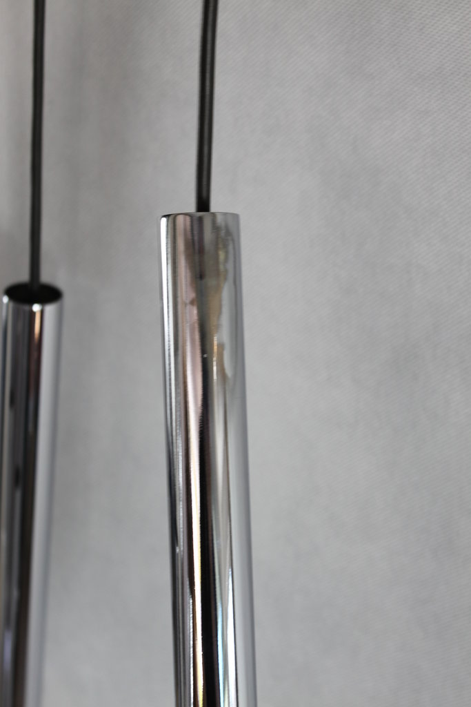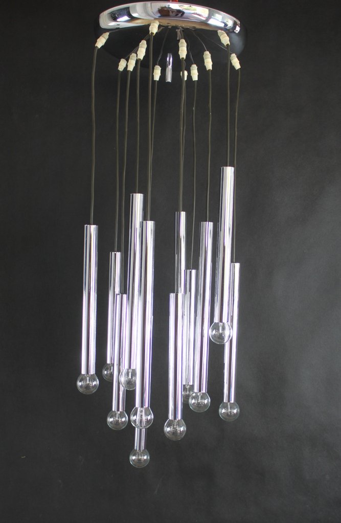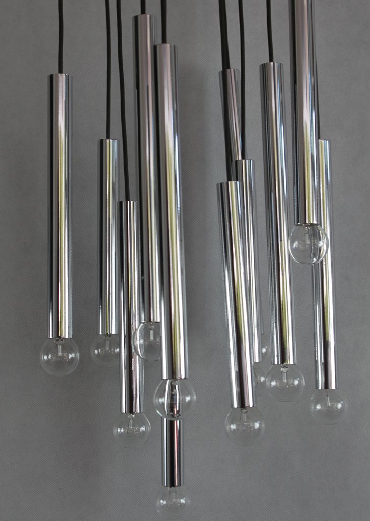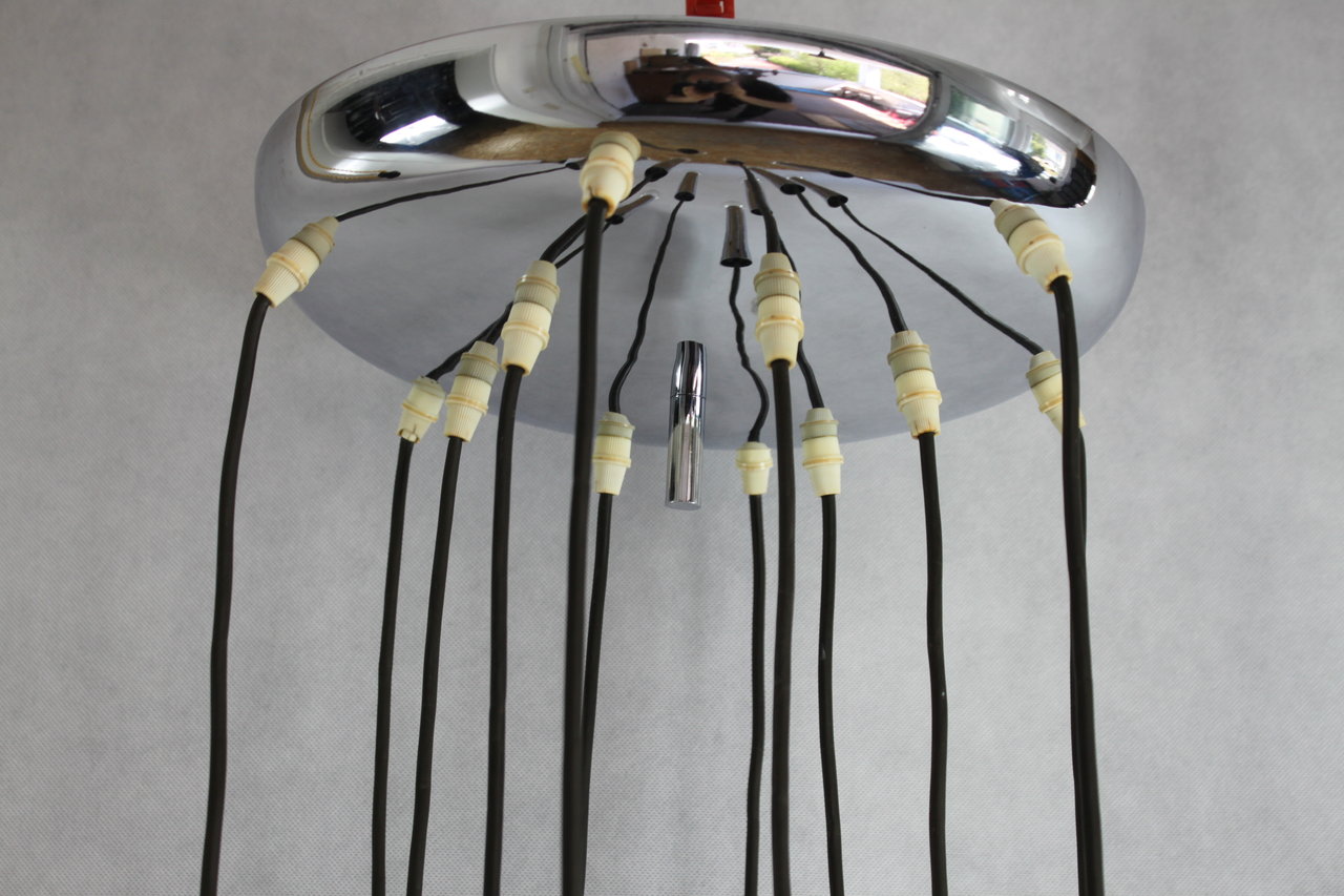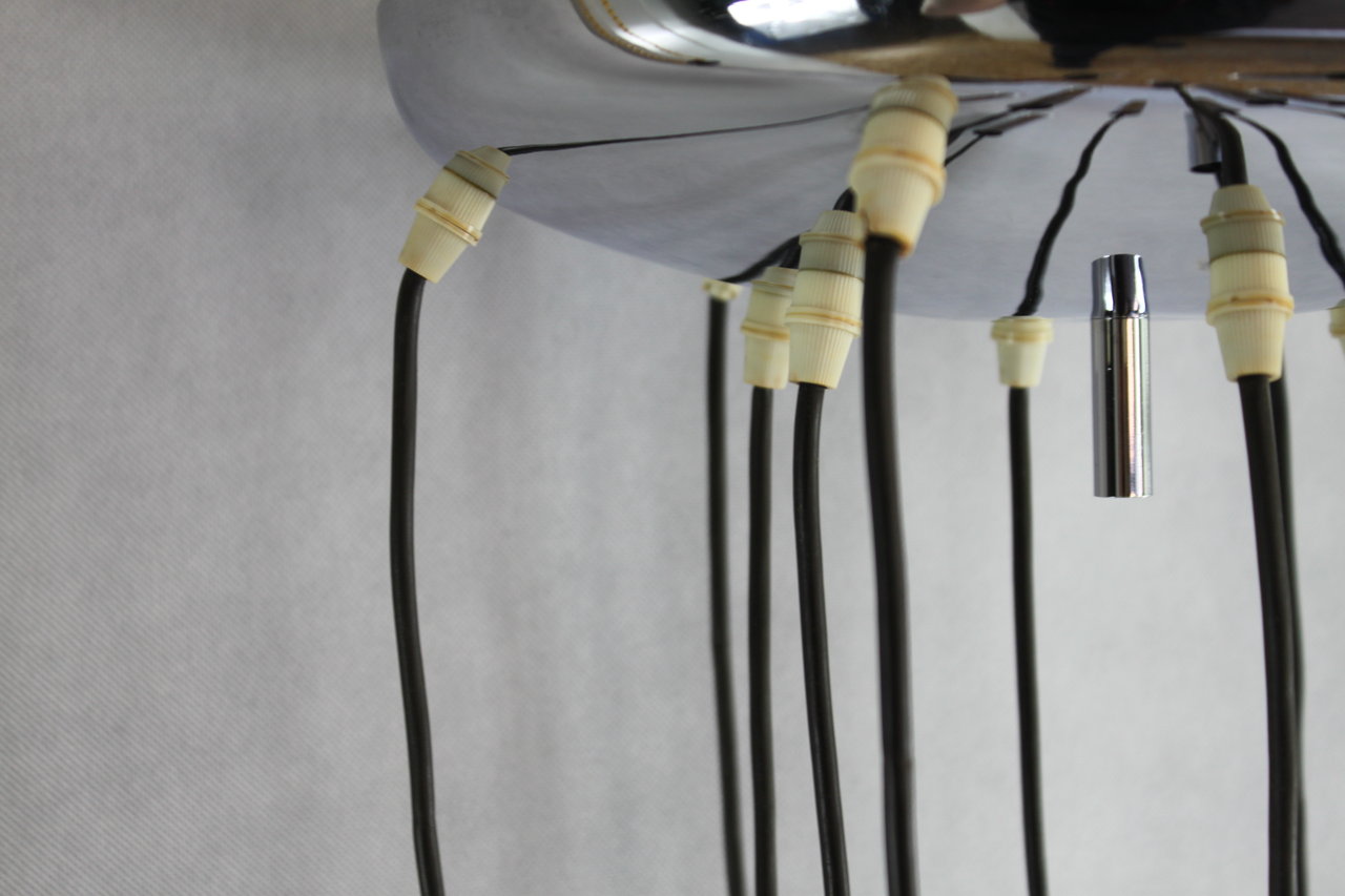 Die Deckenleuchte ist verchromtem Metall gefertigt. Die Lampe verfüht über 12 Brennstellen mit handelsüblichen E14 Fassungen (Lieferung inkl. Leuchtmittel).
