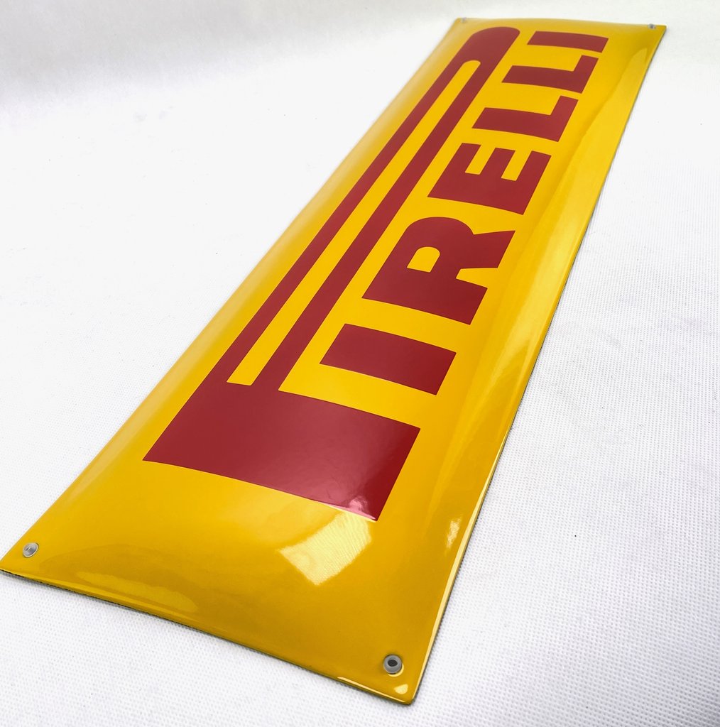 Dieses neuwertige PIRELLI LOGO – Emailleschild war nie an der Wand angebracht. Das gewölbte Replikaschild hat einen tollen Glanz.