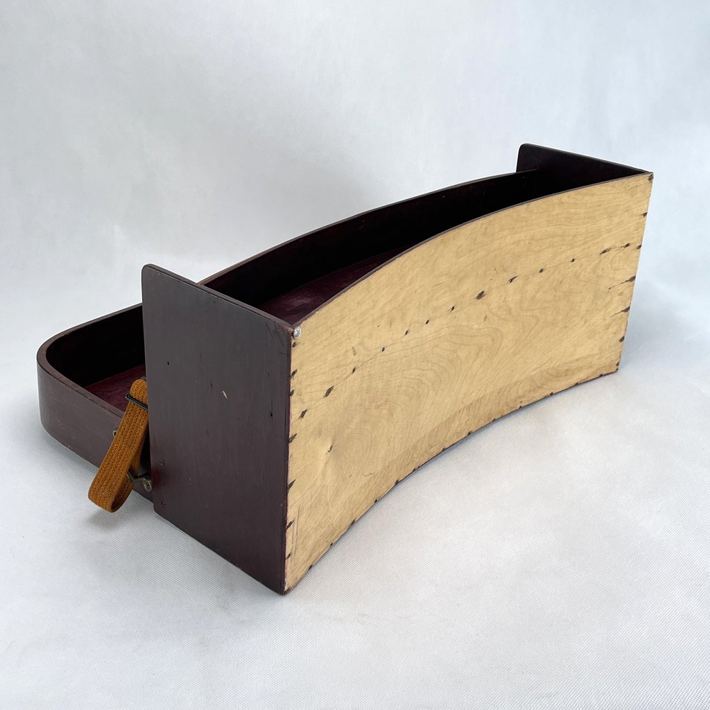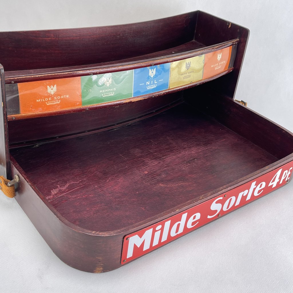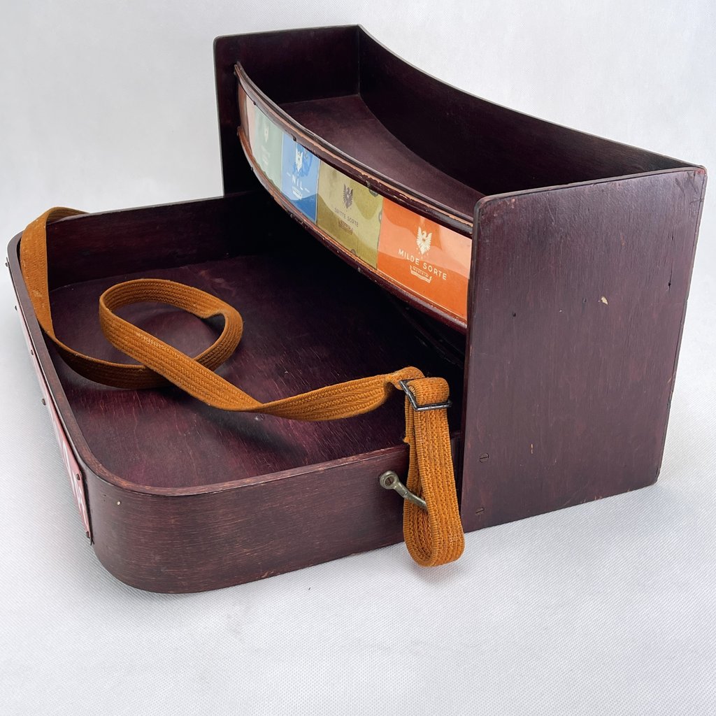 Mit seinen verschiedenen Fächern bietet der Bauchladen ausreichend Platz für allerlei Schätze. Am Bauchladen ist ein Emailleschild mit der Aufschrift “Milde Sorte 4 Pf.” angebracht.
