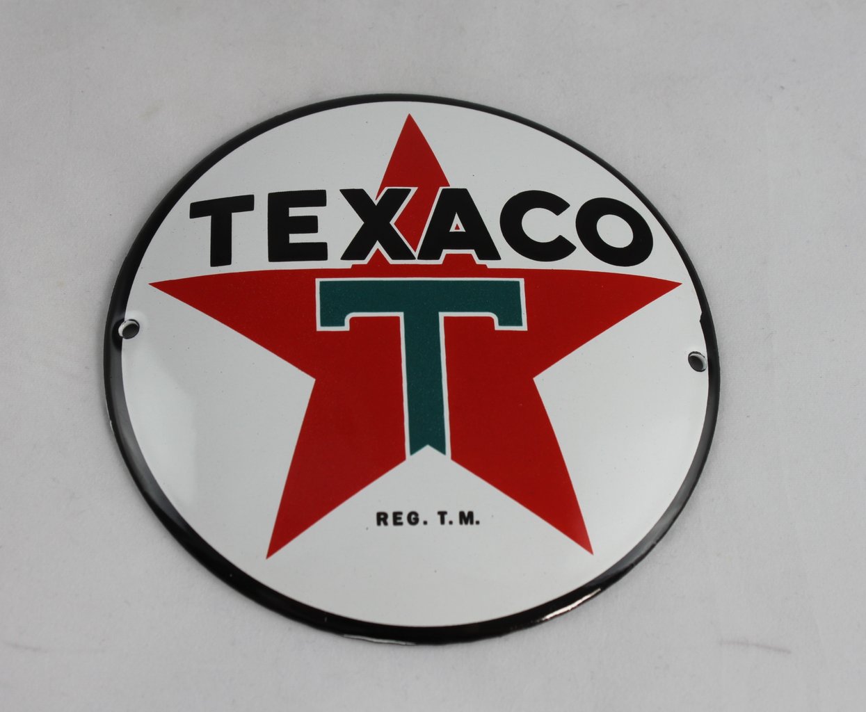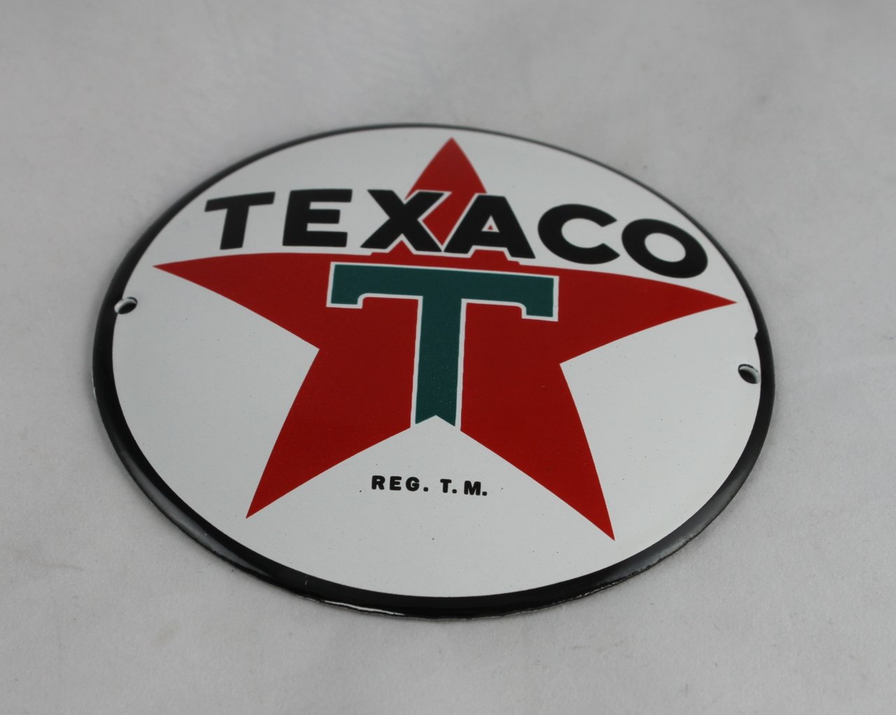 Dieses neuwertige gewölbte Texaco Emailleschild war nie an der Wand angebracht. Es hat an der Seite jeweils ein Befestigungsloch. Es ist für den Innen- und Außenbereich geeignet.