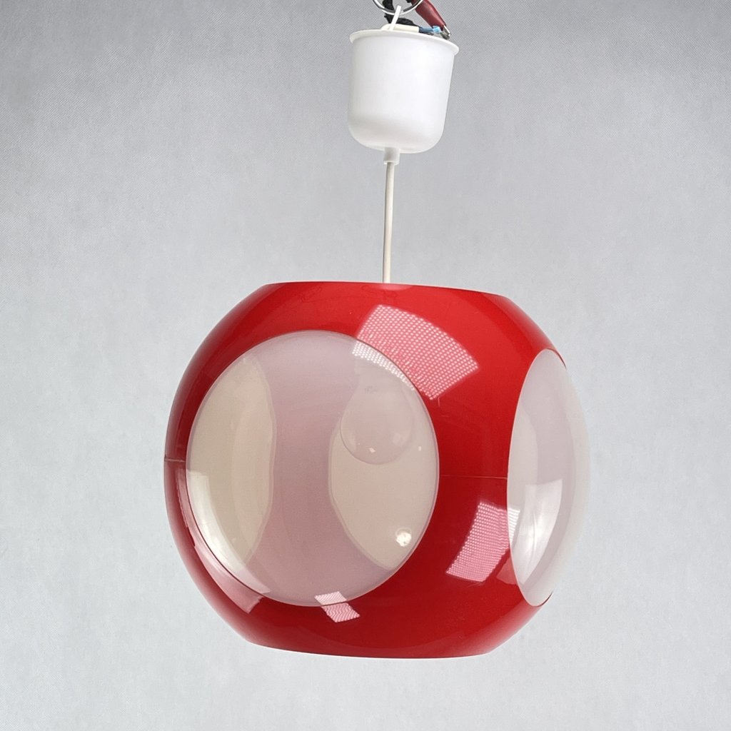 Diese Deckenleuchte im außergewöhnliches Design ist ein Highlight für jedes Lounge-Interieur der Panton-Eames-Ära. Sie ist ein echter Designklassiker aus den 70er Jahren. Die Kugel-Lampe ist aus Kunststoff gefertigt.