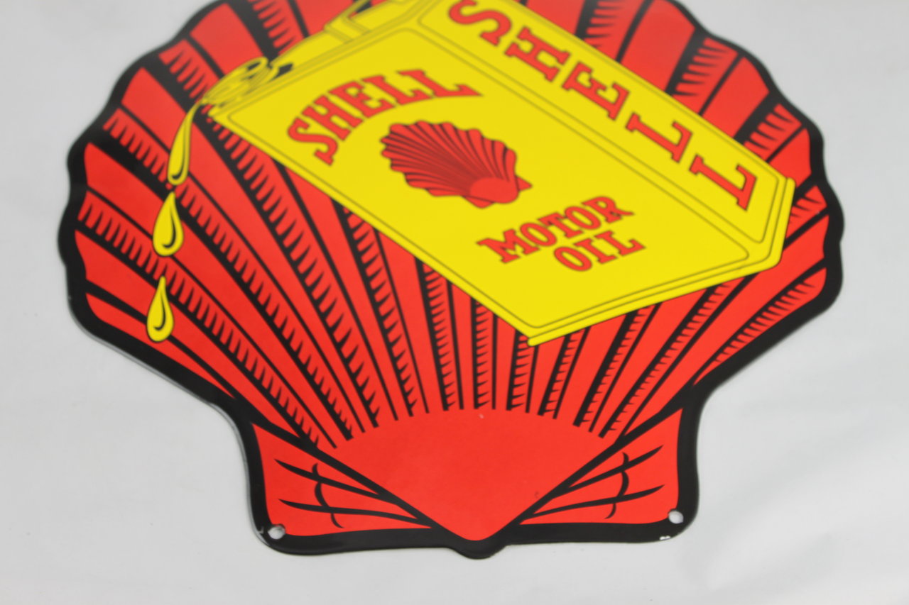 Dieses neuwertige gewölbte SHELL Muschel Emailleschild war nie an der Wand angebracht. Es hat an der Seite jeweils ein Befestigungsloch. Es ist für den Innen- und Außenbereich geeignet.