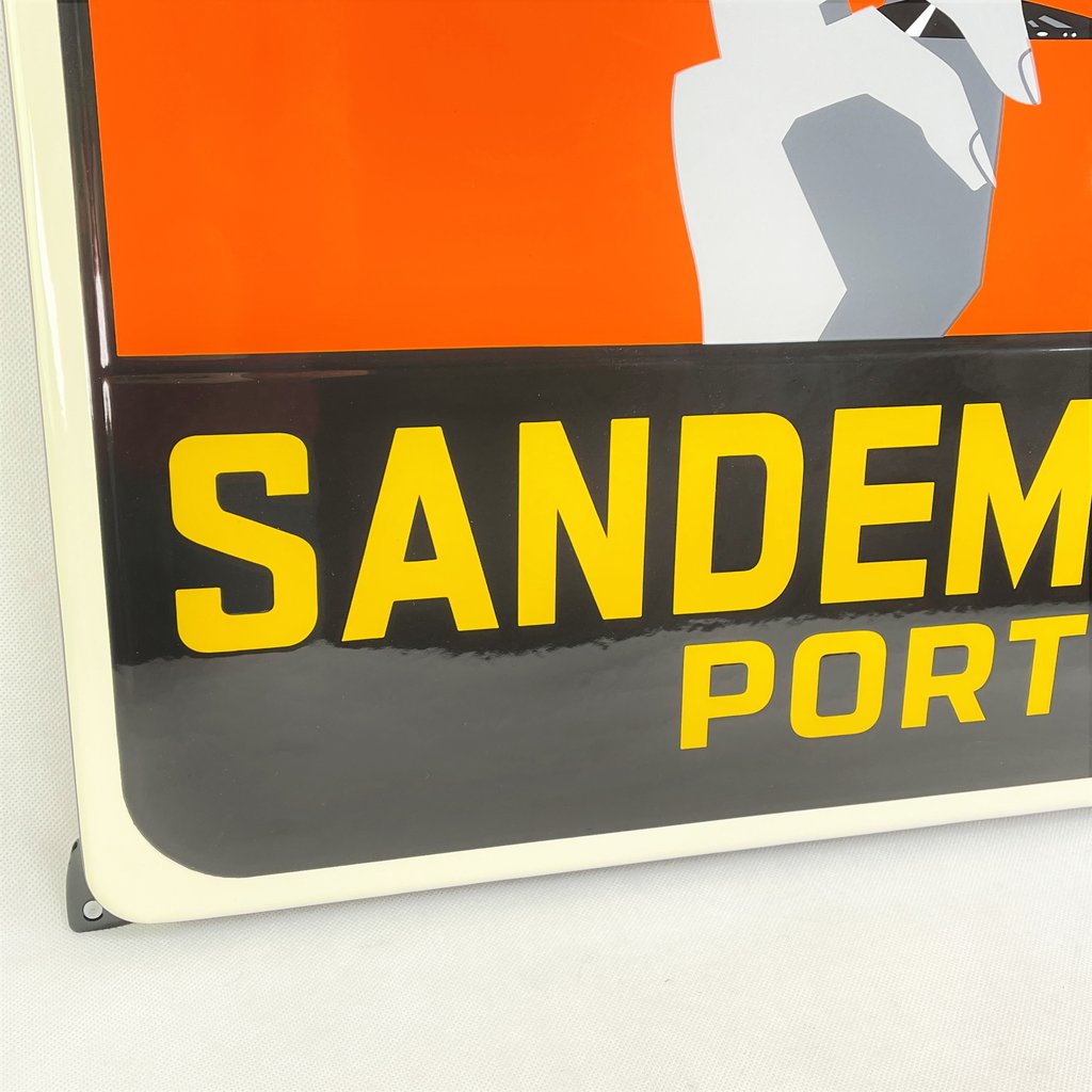 Dieses große, neuwertige, gekanntete Sandeman´s Port – Emailleschild war nie an der Wand angebracht. Das Motiv zeigt eine junge Frau, die mit ihrem hypnotischen Blick dem Betrachter zuprostet und diesen in ihren Bann zieht.